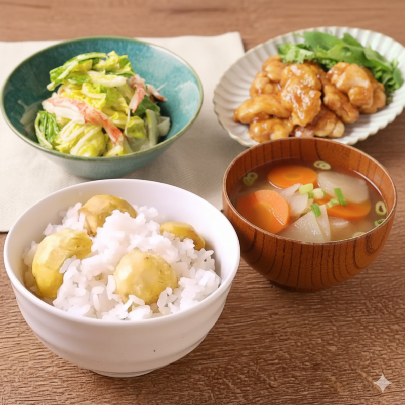 秋の味覚を楽しもう!栗ご飯にぴったり合うおかずトップ5」 - 旬の食材の調理法や保存方法で、おうちごはんがもっと美味しくなる。