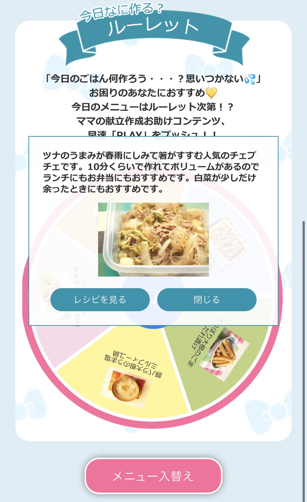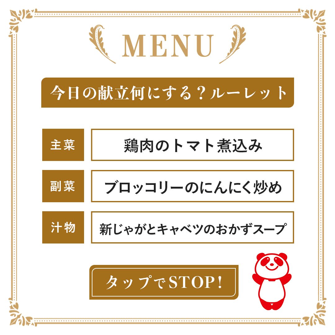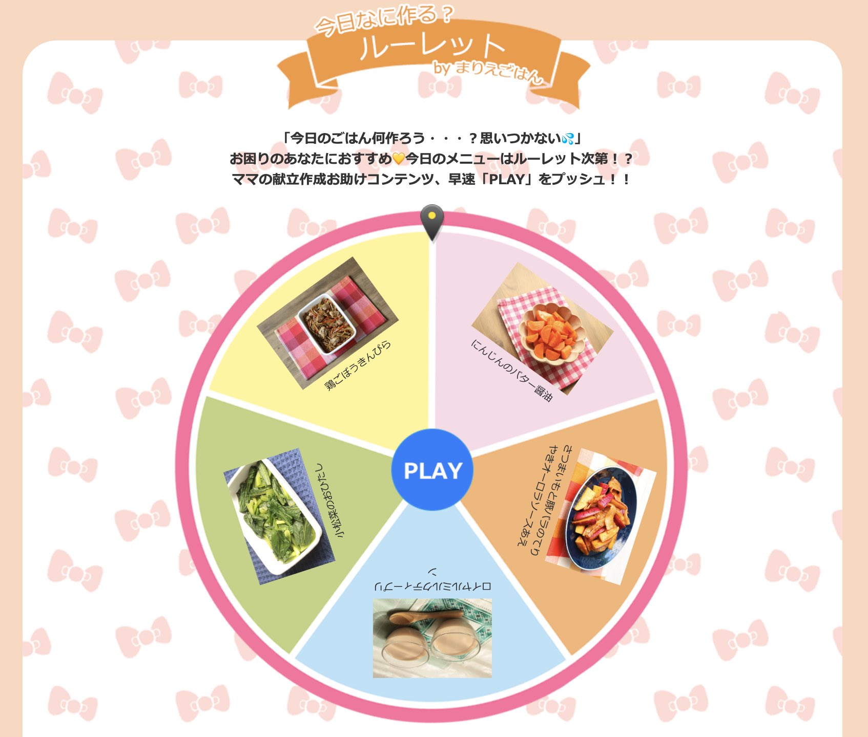 つくりおき食堂まりえ on X: "今日のご飯どうしよう? ってときに今日なに作る?ルーレット がおすすめ! PLAYボタンをタップしたらルーレットがまわり、おすすめレシピが出てきます。今日なに作ろうかな?というときルーレットまわして下さいね。 PR 献立に迷う。