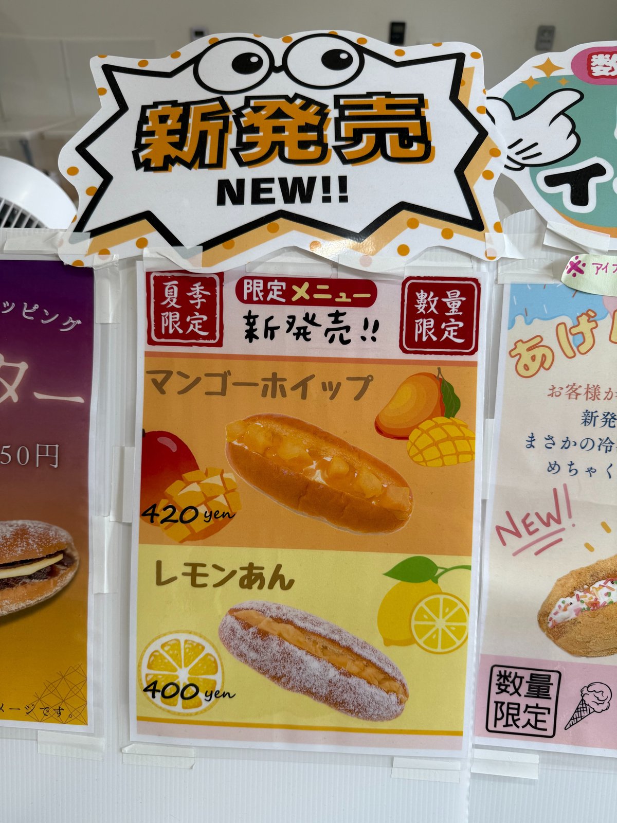 揚げパンカスタードホイップにマンゴーをトッピングした 商品を販売しました!自家製のカスタードホイップとマンゴーをトッピングでスッキリと食べやすくなってます。 是非お試し下さい😋 値段200円。