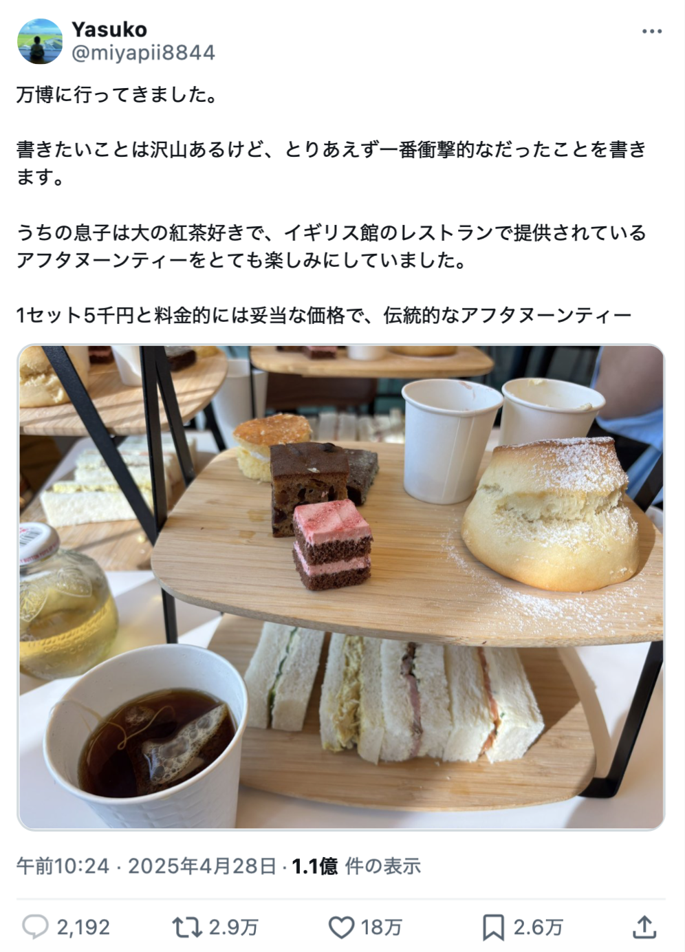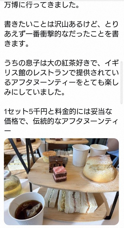 大阪万博のアフタヌーンティー、炎上してますねえ 🔥 個人的に私はそこまでアフタヌーンティー好きではないんですが、あれって食の質よりもその会場の雰囲気や同伴者とのお喋りなども含めて完成される、言うなれば体験型アトラクション的なものなんですよね。なので。