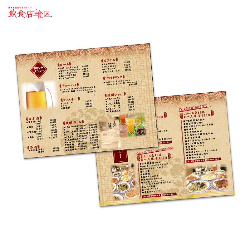 中華料理店 コース料理・飲み物メニュー表デザイン制作飲食店輪区。