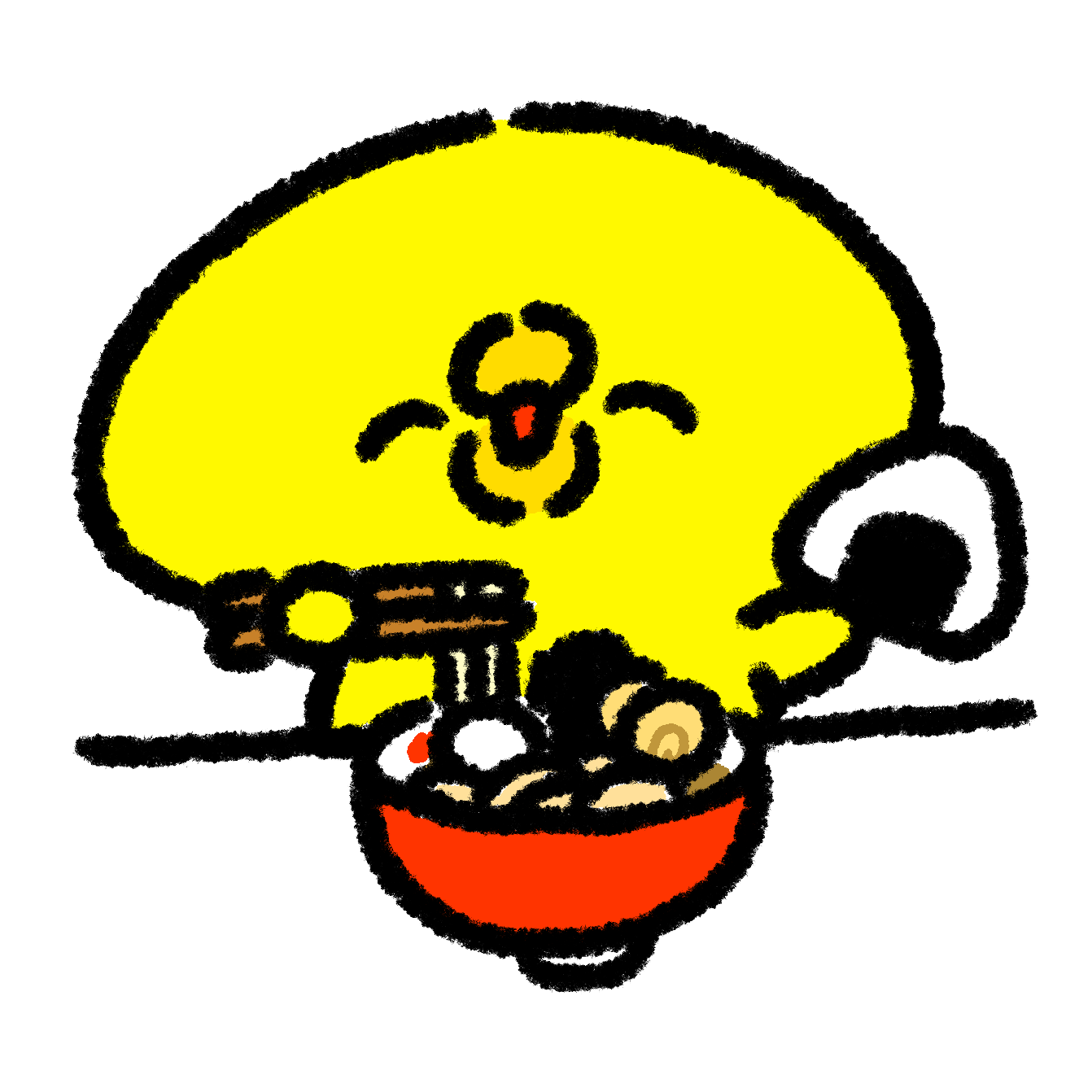 ラーメンとおにぎりを食べるひよこのイラストゆるくてかわいい無料イラスト・アイコン素材屋「ぴよたそ」。