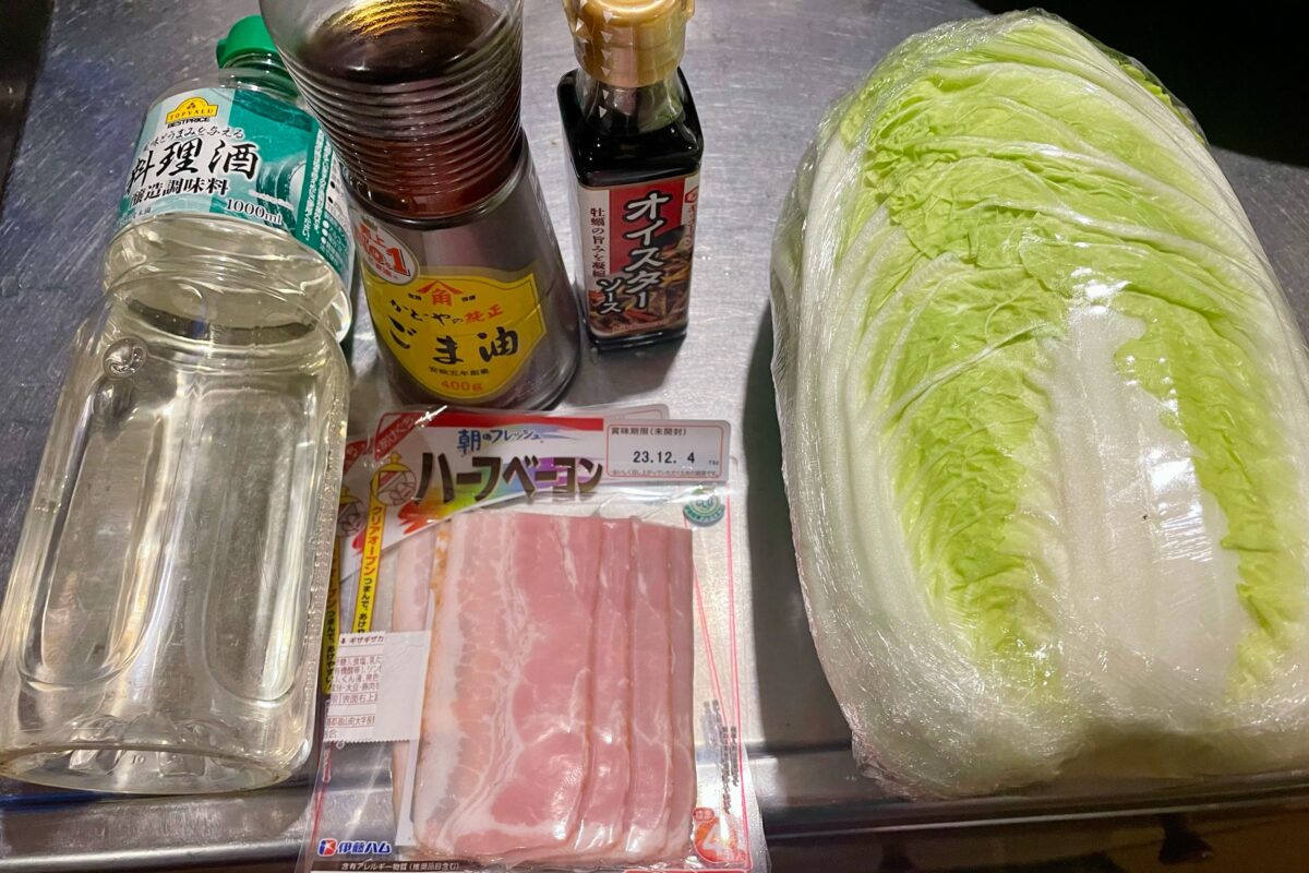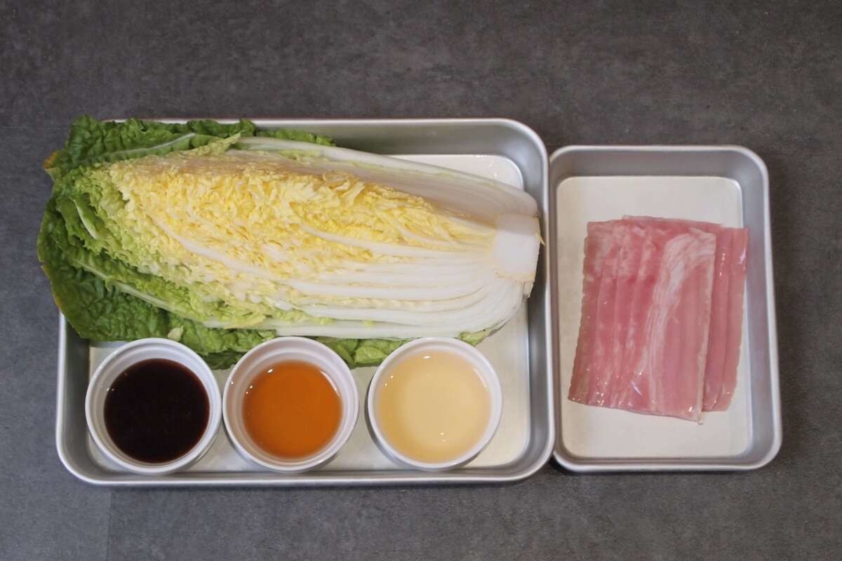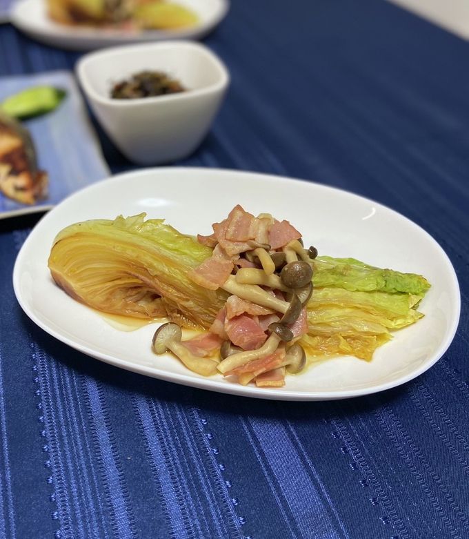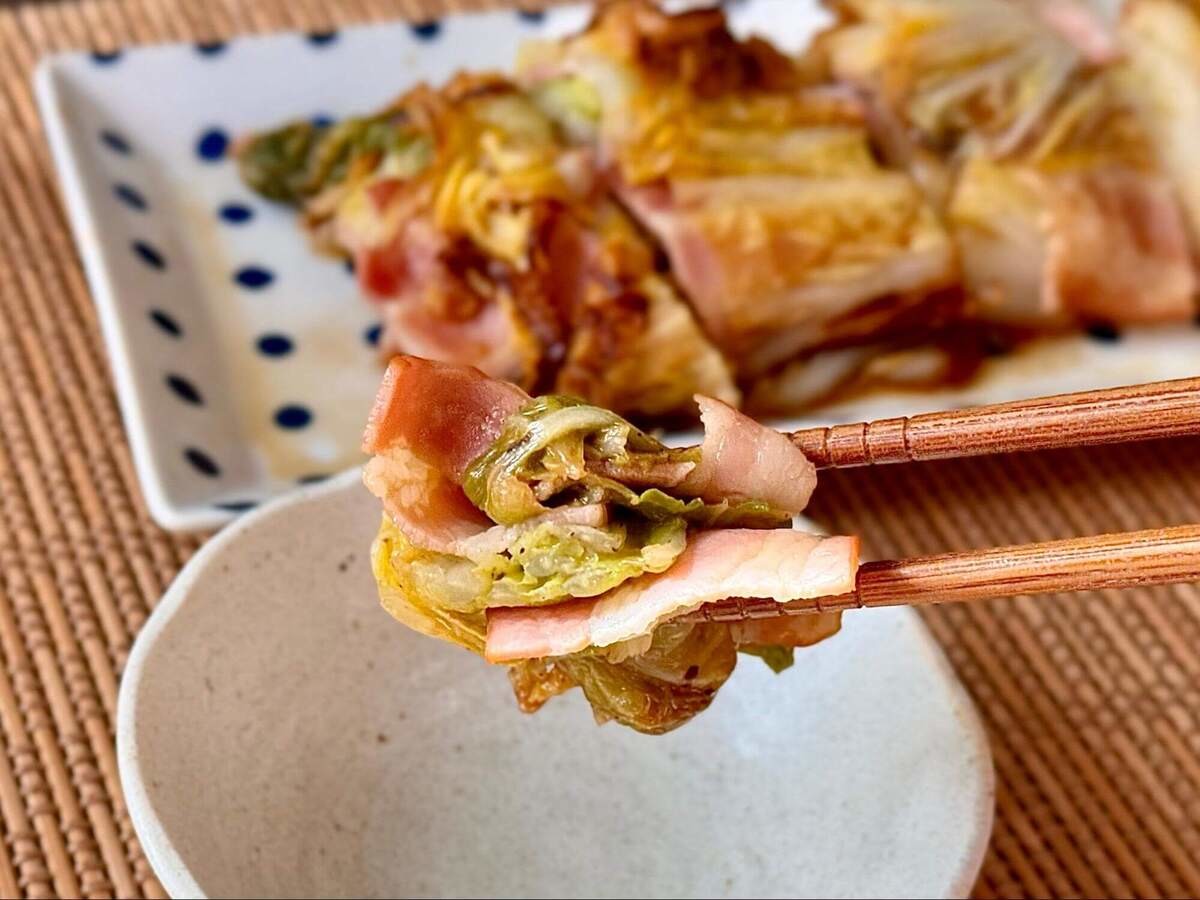 白菜ステーキ ①白菜1 4玉をラップで巻いて600Wで3分程度レンチン ②サッと水洗いし、白菜の葉の間に薄切りベーコン60gを均一に挟み、ごま油大さじ1をひいたフライパンにのせ中火で焼く③5分ほど焼いたらひっくり返し、酒大さじ2とオイスターソース1と1 2を入れ。
