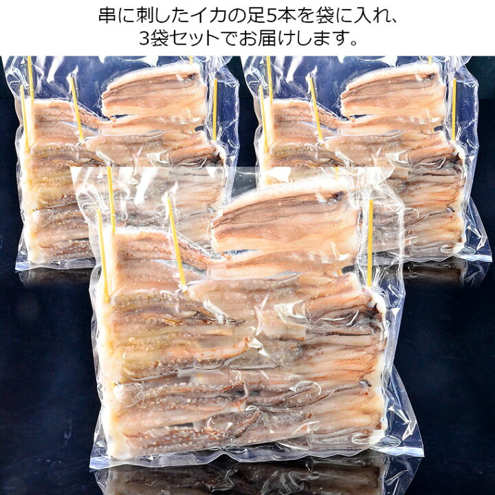 楽天市場 送料無料 国産 いか下足 串 薄塩味 5本入り × 3袋セット 加熱用 BBQバーベキューキャンプ飯 おつまみ おやつスルメイカの足ゲソを串打ち 1本60g前後 焼きいか から揚げ 麺類焼きそば ラーメン スパゲティの具材にも 海鮮。