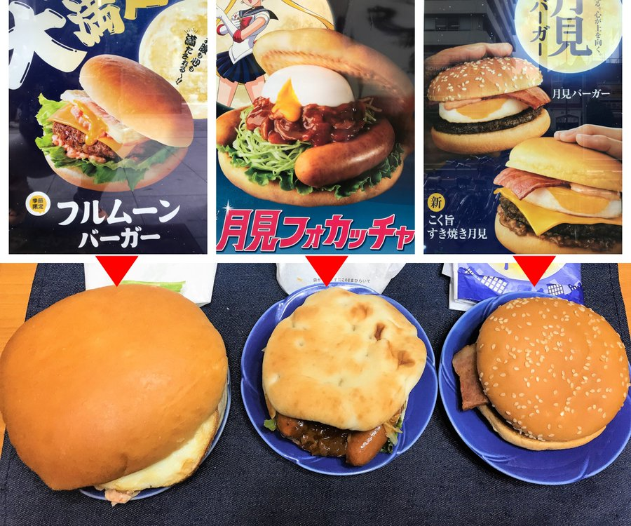 コメダ「フルムーンバーガー」の“逆”詐欺サイズ際立つ 各社「月見バーガー」のイメージと実物の比較画像が話題にまいどなニュース。