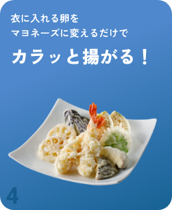 天ぷらをカラッとさくさくに!サクサク天ぷらマヨネーズの裏ワザ4とっておきレシピキユーピ。