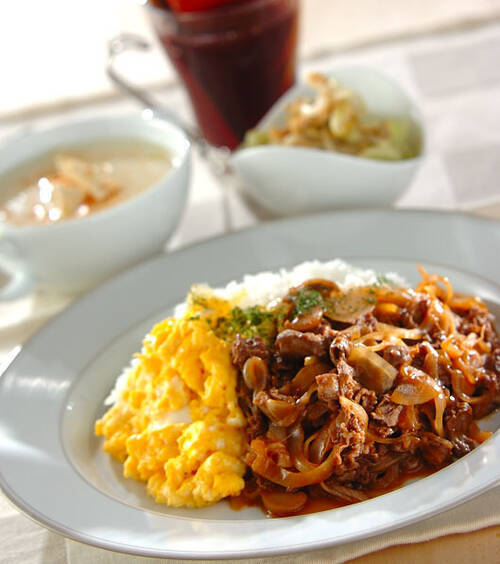 卵のせハヤシライス」の献立・レシピ - E・レシピ 2014.09.22公開の献立です。
