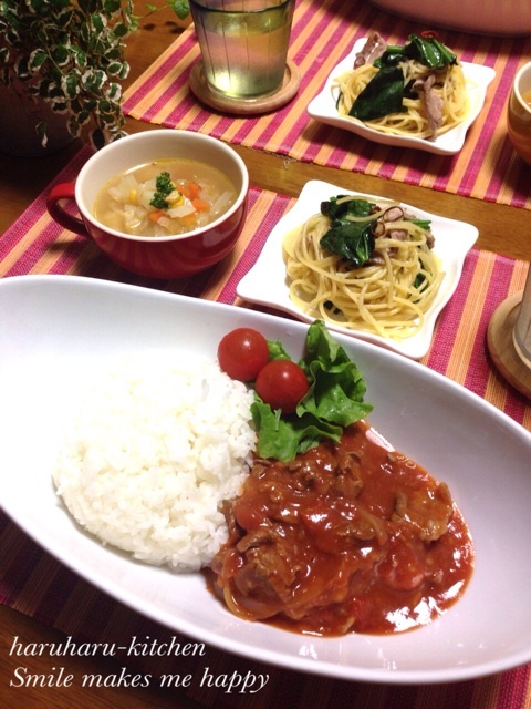 献立 4人家族の晩ごはん トマト缶で簡単ハヤシライスかいかい❤︎お鍋ガールズ。