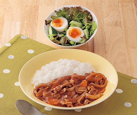 完熟トマトのハヤシライス 半熟卵のサラダ 食材宅配のヨシケイ 夕食ネット レシピ・メニュー・献立付き。