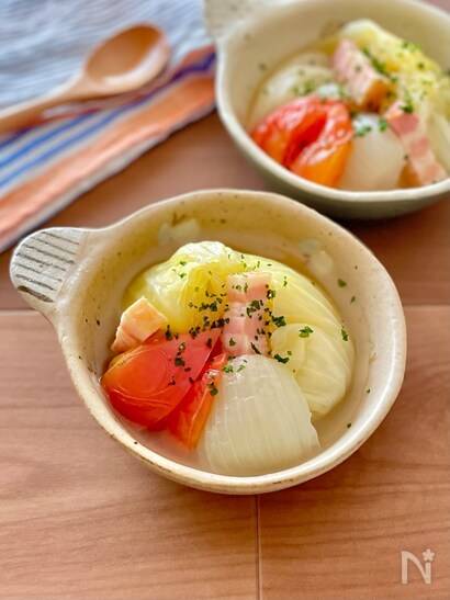 ハヤシライス の献立 副菜:キャベツとベーコンのコンソメ重ね蒸し、汁物:豆腐とねぎのオニオンコンソメ 献立・メニュー 味の素パーク たべる楽しさを、もっと。