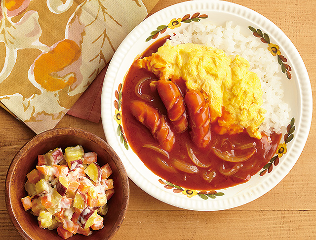 ぷるぷるたまごのハヤシライス、ころころさつまいもサラダeフレンズ ぱくぱく献立くん。