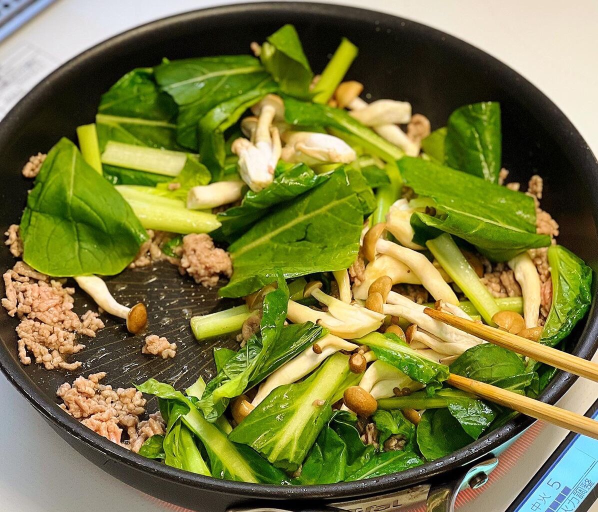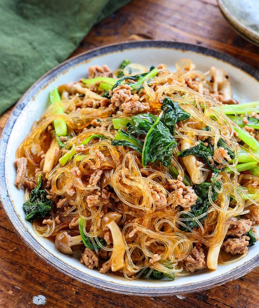 Yuu料理家 on X: "\ 別茹で不要小松菜のそぼろチャプチェフライパンひとつで作れる上、春雨は煮ながら戻すので味がしみしみ😋ひき肉と小松菜たっぷりで食べごたえがあり、栄養も満点💯 甘辛味と春雨効果で、小松菜が苦手なお子様も食べやすいですよ。