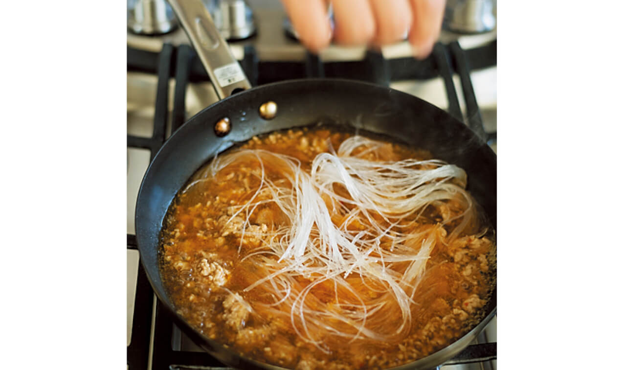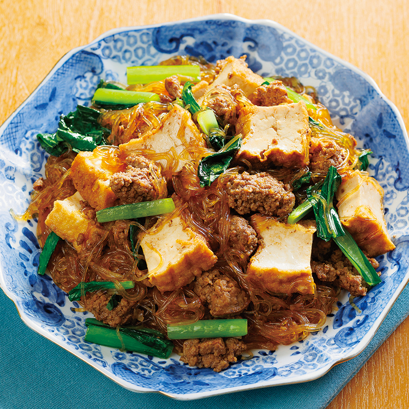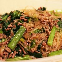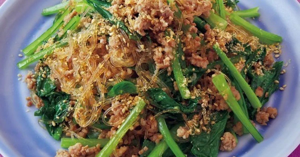小松菜とひき肉 ミンチ の春雨炒め煮 人気の春雨メニュー。