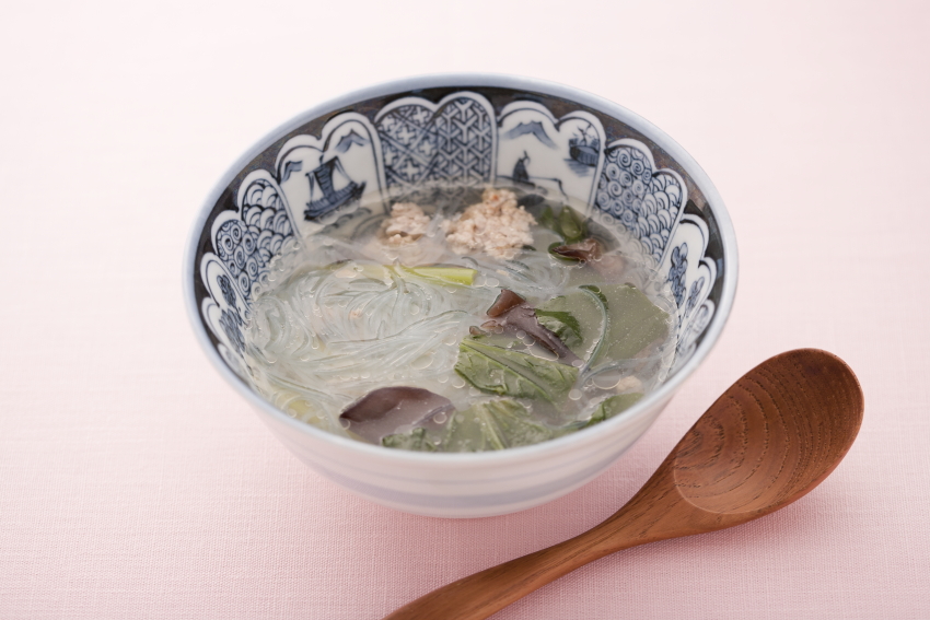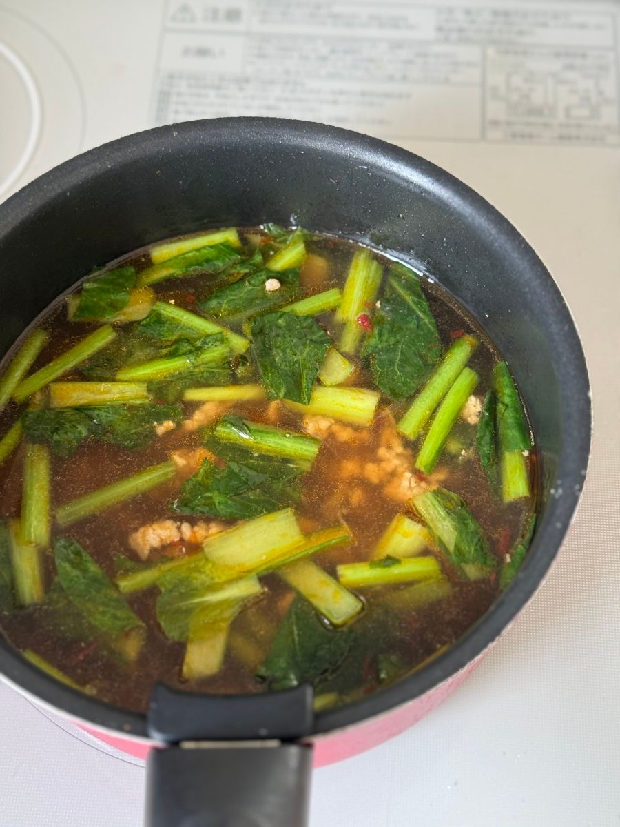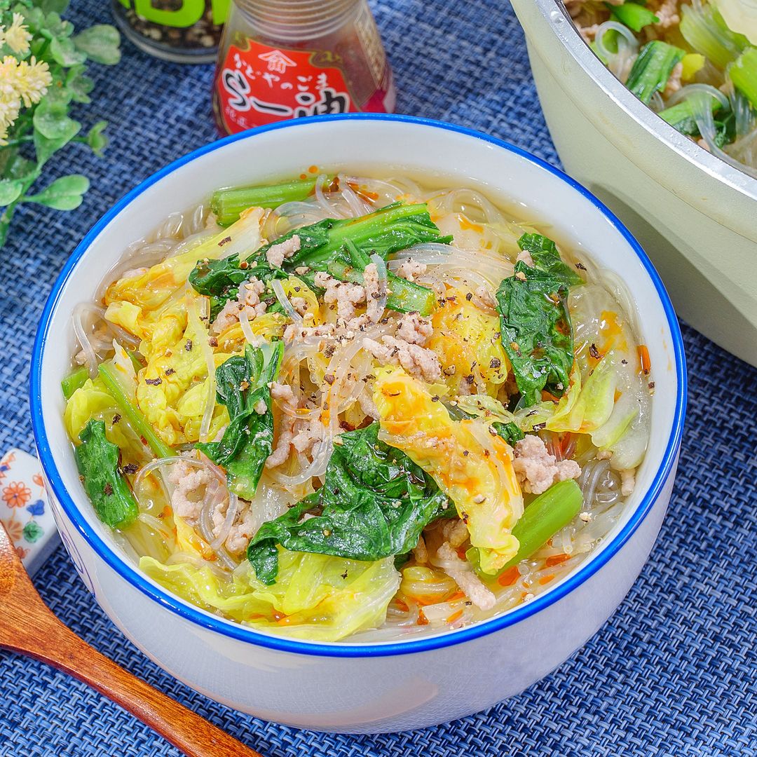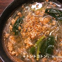彩り◎旨みたっぷり♡ 小松菜とひき肉の春雨スープ 具だくさん。