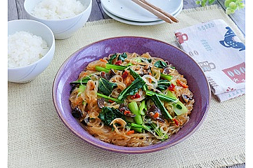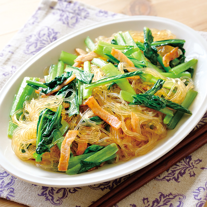 春雨LOVE 春雨で、いつもの野菜炒めがごちそうに大変身♪ワンランク上の美味しさにするコツを紹介します!<小松菜と豚肉の春雨炒め>。