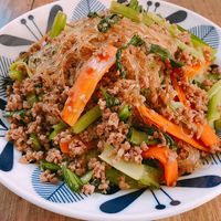 ひき肉と小松菜の麻婆春雨♩野菜も主役!家族が喜ぶ満腹レシピ。