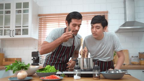 カップルが一緒に料理をしながら料理を試飲無料写真。