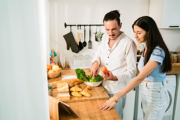 白人の幸せなカップルがキッチンに立ち、一緒に料理するためにたくさんの野菜や果物を準備するカップルが健康的な食材を使って料理を楽しむ健康的なウェルネスのライフスタイルコンセプトPremium写真。