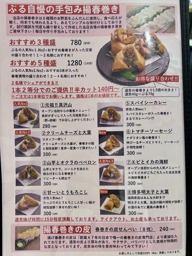 武蔵小山の春巻き専門店 20種類以上 パリパリ美味しい春巻きメニュ。