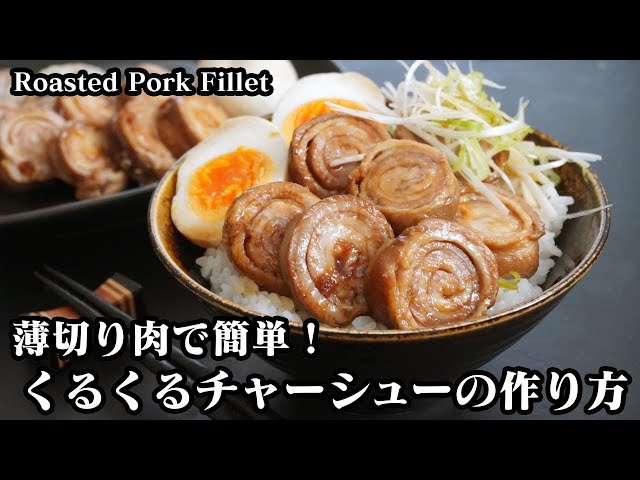 豚薄切り肉で簡単「くるくるチャーシュー 焼き豚 」下茹で不要!煮込み時間短縮‼味が染み込んだお手軽焼き豚の作り方 - YouTube。