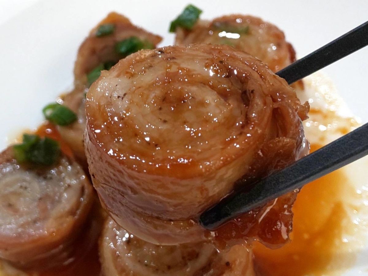 レンジで簡単メイン料理 豚バラ薄切り肉でくるくるチャーシューの作り方パンダワンタン。