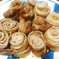 ワンパンでズボラくるくるチャーシュー材料豚バラスライス400g200g×2パック片栗粉大さじ2 サラダ油適量 しょうゆ 大さじ3 料理酒大さじ3 砂糖大さじ3 おろしにんにく2cm ※ゆで卵作り方①豚バラスライスをパックから取り出したら広げ重ねたままクルクルしちゃう ②全体に片栗粉をまぶす ③サラダ油で②の表面に焼き目を付けたら弱火にする。