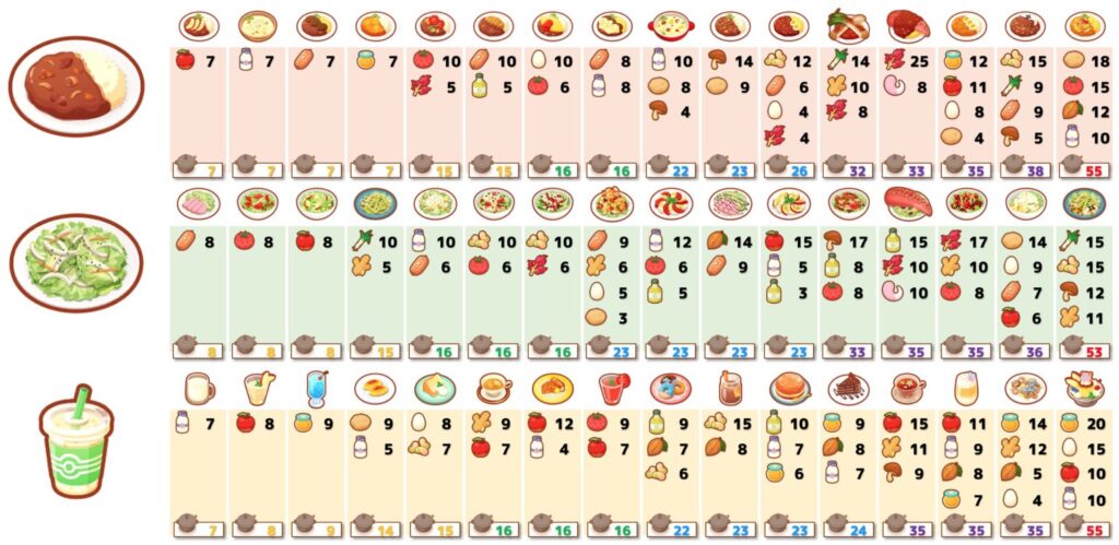 だいふく on X: "ポケモンスリープの 料理・使用食材・エナジー を一覧表にまとめました! ①全料理の一覧表 ②カレー・シチューの一覧表③サラダの一覧表 ④ドリンク・デザートの一覧表 の4枚作成したので、用途に合わせてご使用ください!レシピサイトに飛ぶのが面倒。