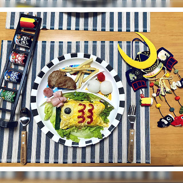 こんばんは 𖤣𖥧𖥣𖡡𖥧𖤣今日の献立 𓎩𓌉𓇋ꕤお子様ランチ風プレート オムライス ハンバーグ かぶと春巻きミニナポリタン ꕤ豆腐とトマトのカプレーゼ ꕤコーンポタージュ ꕤキウイフルーツ ꕤ柏餅5月5日は子供の。