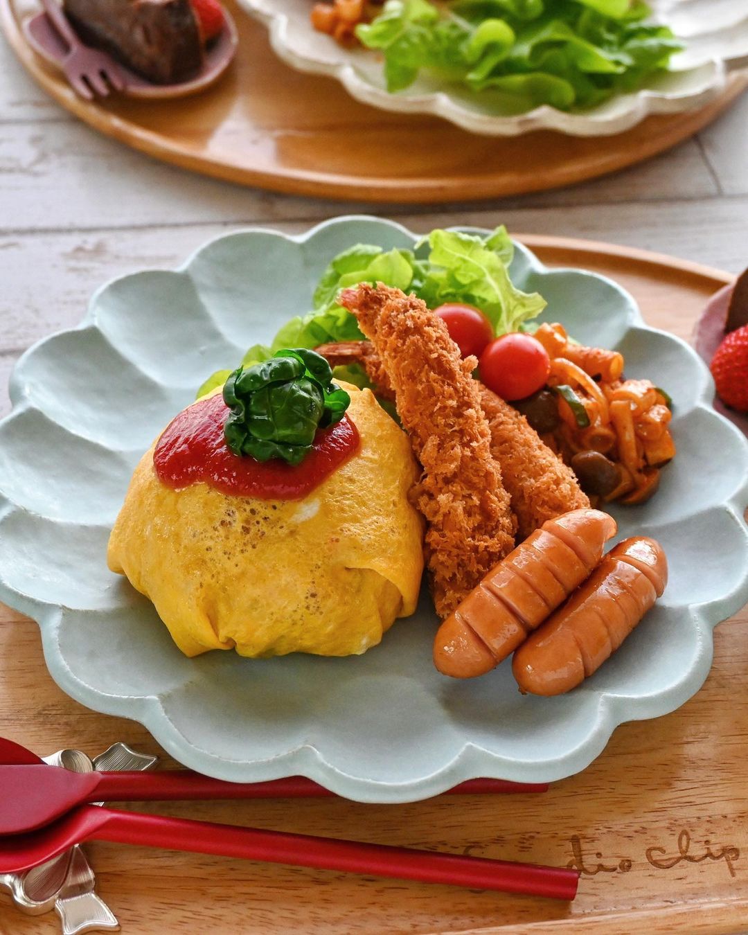 オムライスプレート作りました🍳💛🪸 ケチャップライスも好きだけど、たまには違うのも食べたくなるよね🌝🙏🏼再投稿🙏🏼いいねくださってた方すみません🥲おうちごはんフーディーテーブルおうちごはんloverてづくりごはん365主婦家ご飯お昼ご飯献立。