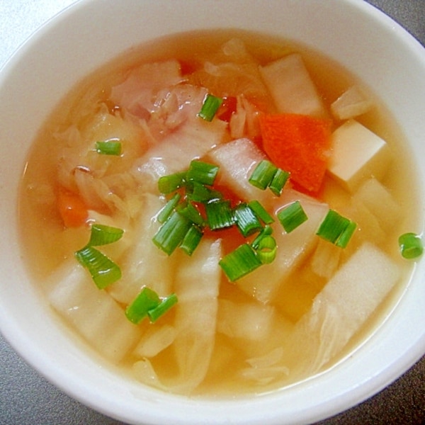 お鍋の具材で朝から手軽に!白菜と豆腐のコンソメスープ。