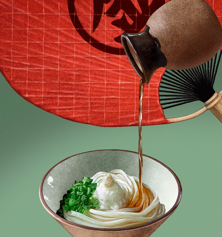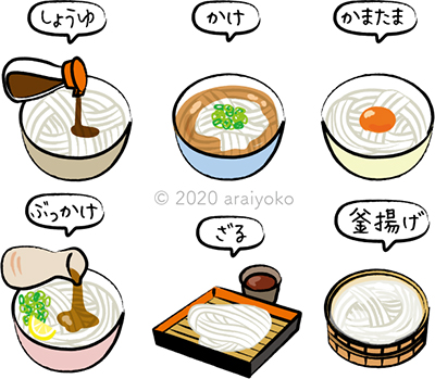 さぬきうどん名店巡礼」特集にてしょうゆ、かけ、かまたま等、さぬきうどんのイラストを描きました公式 イラストレーター アライヨウコ Webサイト。