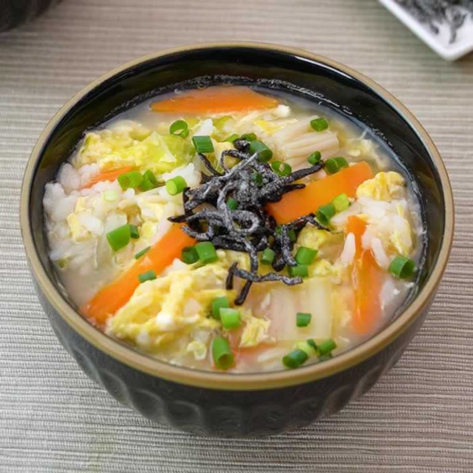 たっぷり野菜の卵ぞうすいのレシピ 作り方:白ごはん.com。