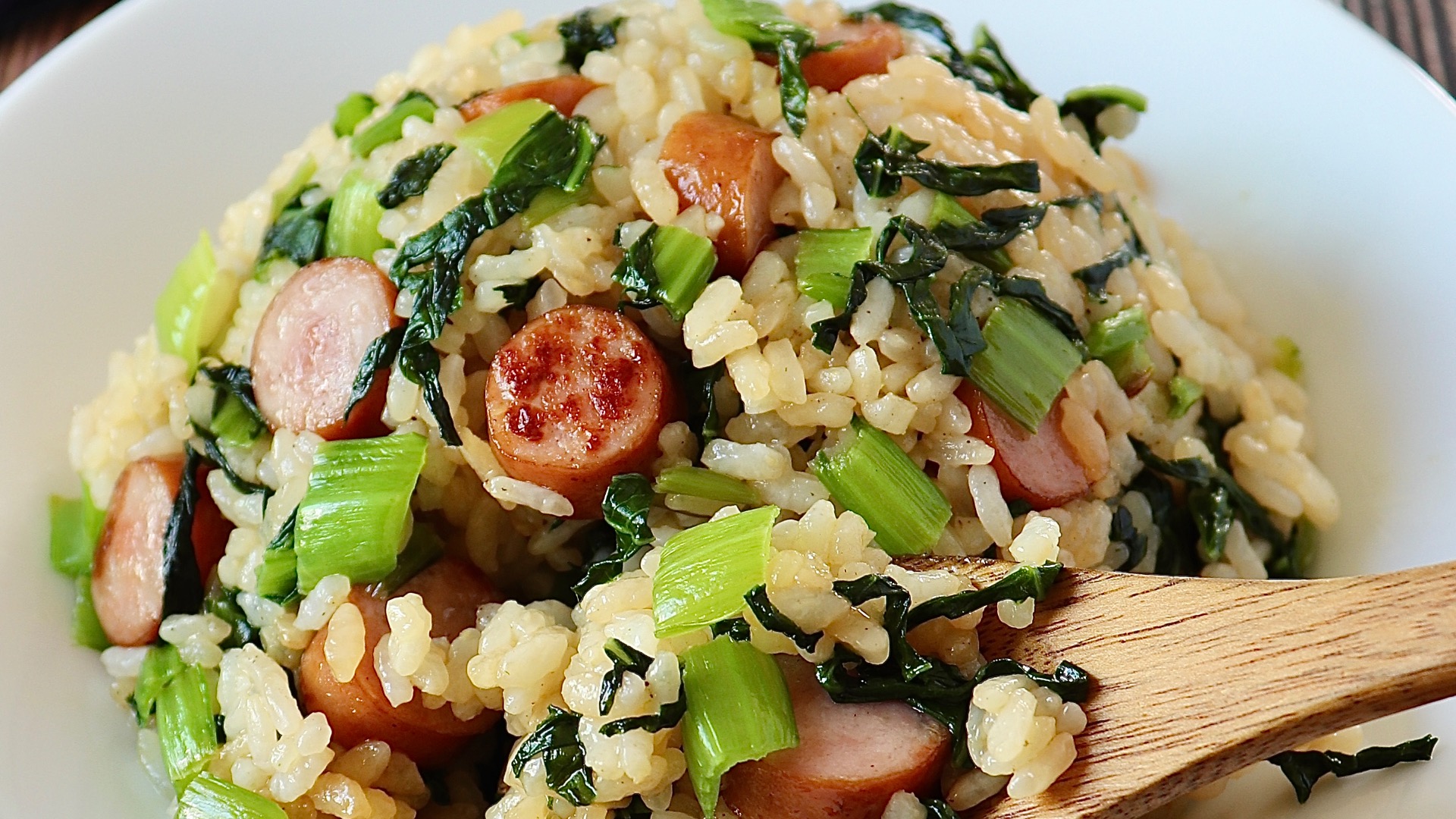 卵がなくたって〇〇でパラパラに!『小松菜チャーハン』準備は万端です。