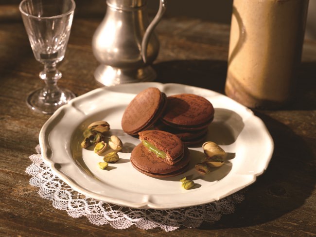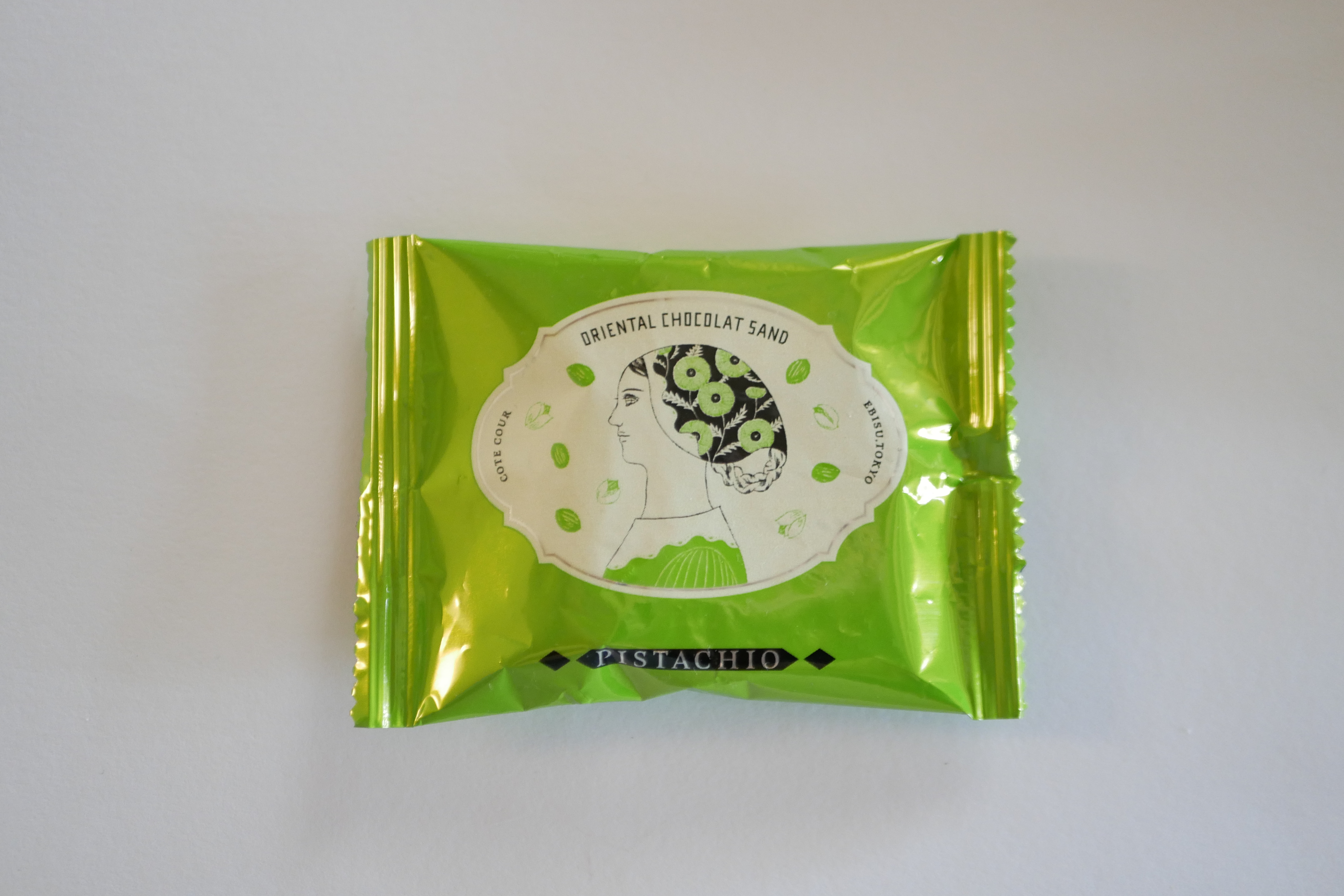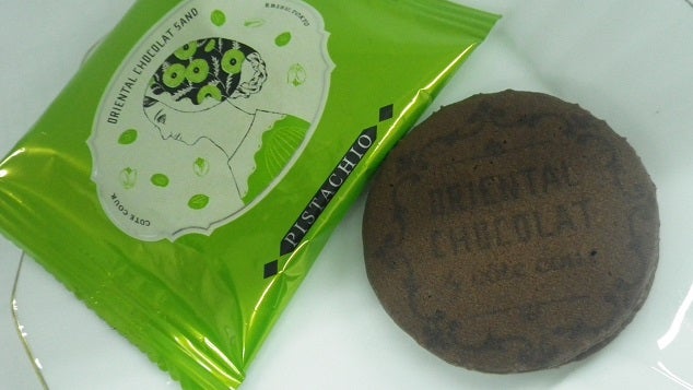 新ブランド「オリエンタルショコラbyコートクール」より 「オリエンタルショコラサンド」 <ピスタチオ>PISTACHIOピスタチオの風味が香る特製ソースを、ミルクチョコレートでコーティングし、ココアクッキーでサンドした、濃厚な味わいのサンドクッキー です。
