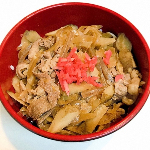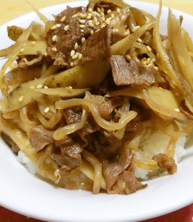 ごぼうと糸こんにゃく入り牛丼 : 食べぼや記 - 冒険レシピ。