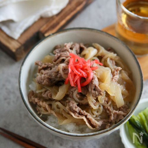 丼ものでNo.1人気!牛丼レシピ 作り方:白ごはん.com。