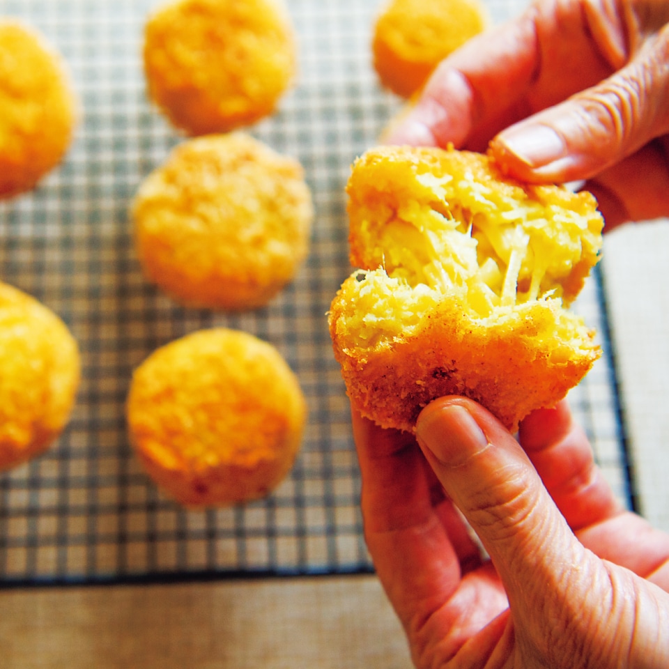 水曜レシピ さつまいもドーナツ まわりはカリッ、中はモチモチ。ひと口サイズのドーナツです。甘さ控えめなので、好みでまわりに砂糖をまぶしたりコンデンスミルクをつけても。
