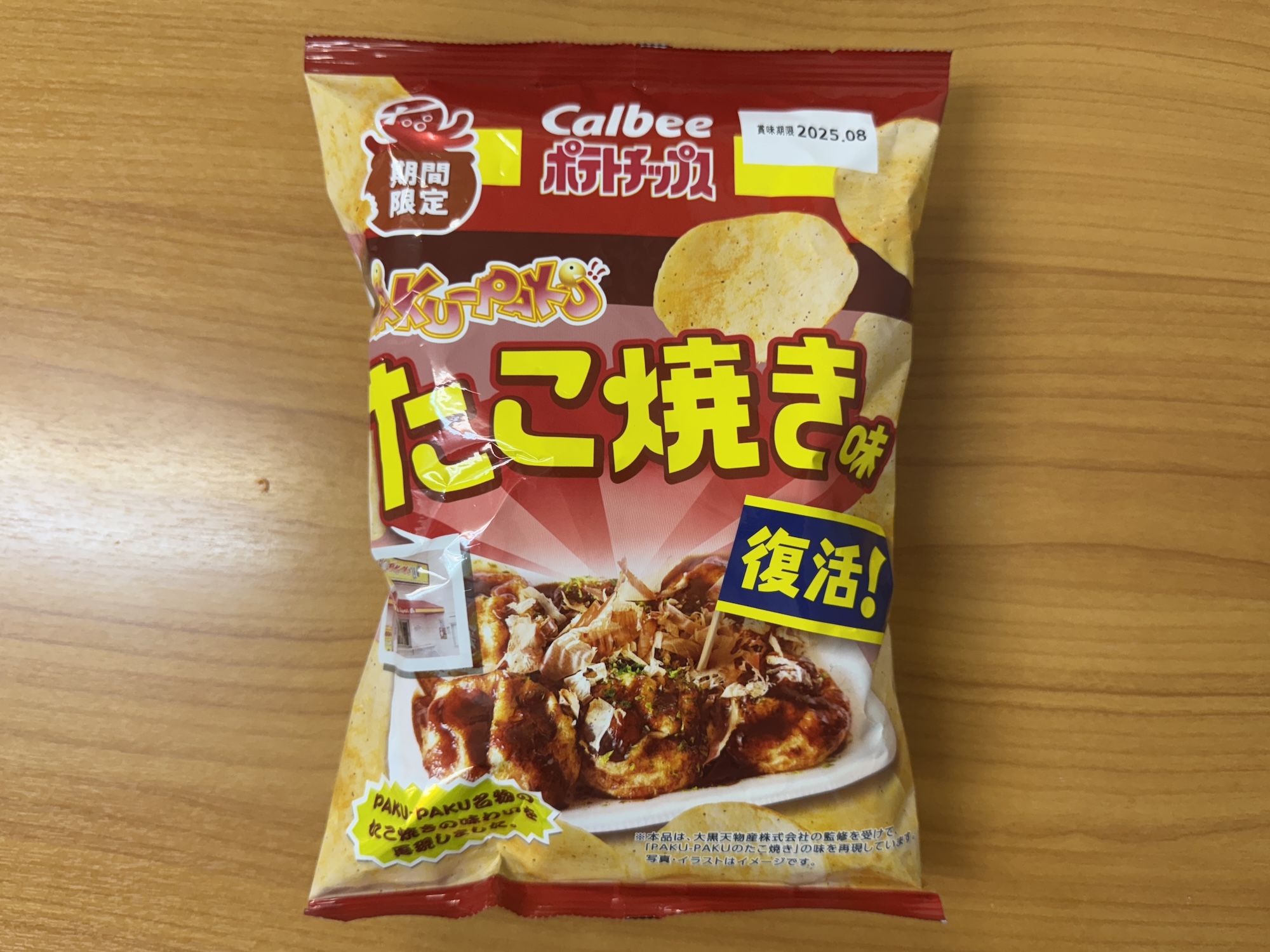 ラ・ムーやディオにある「PAKU-PAKUたこ焼き味」のポテトチップスが登場してる。期間限定でコラボ先は、まさかの「カルビー」。