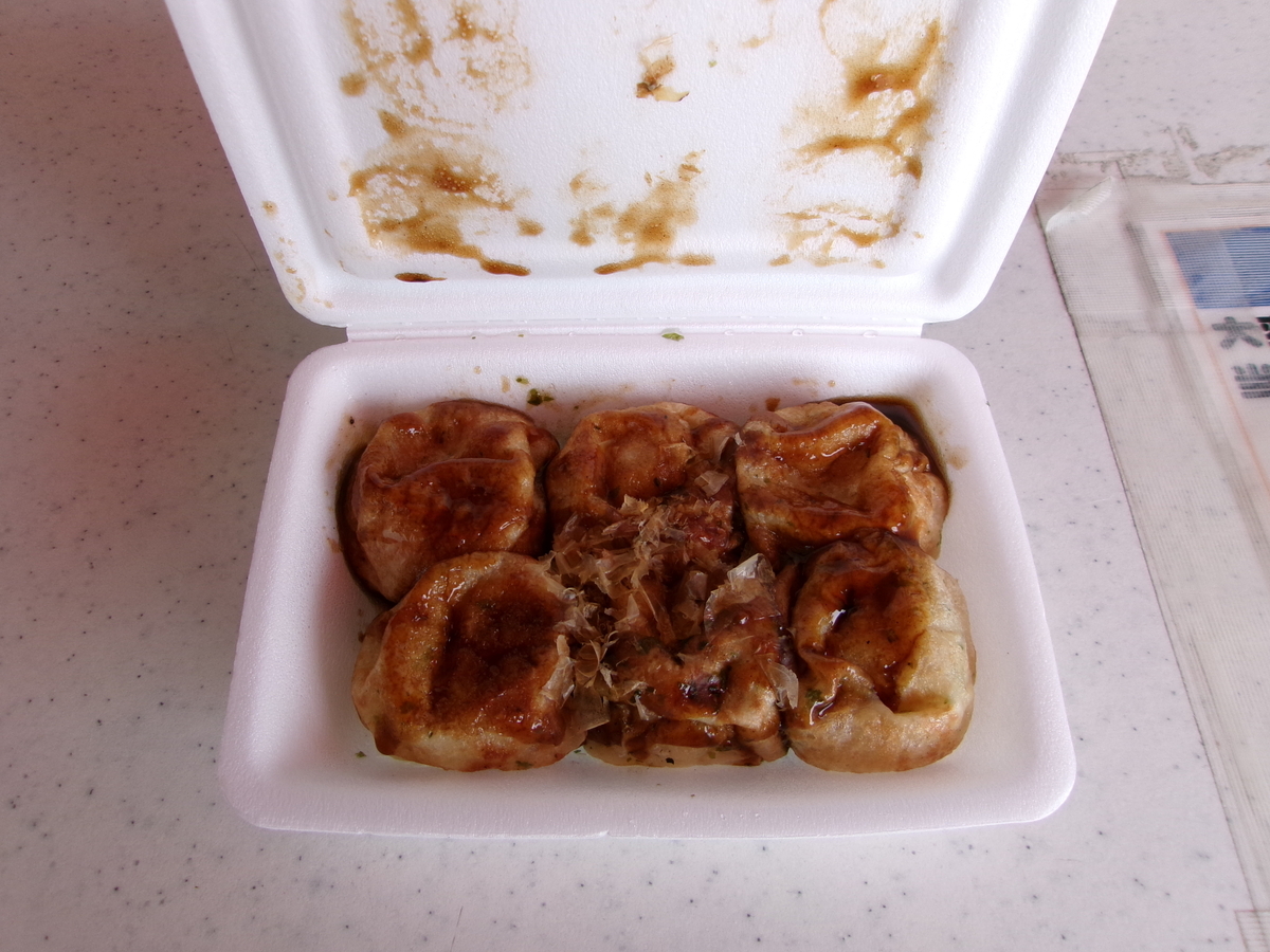ラ・ムーのたこ焼き今日ラ・ムーへ買い物に行ったら、雨降りのせいか?たこ焼きの行列が短かったので、初めて買ってみました。1個が大きくて、6個入って税込100円です。 そりゃ有名店のそれなりの値段がするたこ焼きからすれば、味が落ちるとは思いますが、値段。