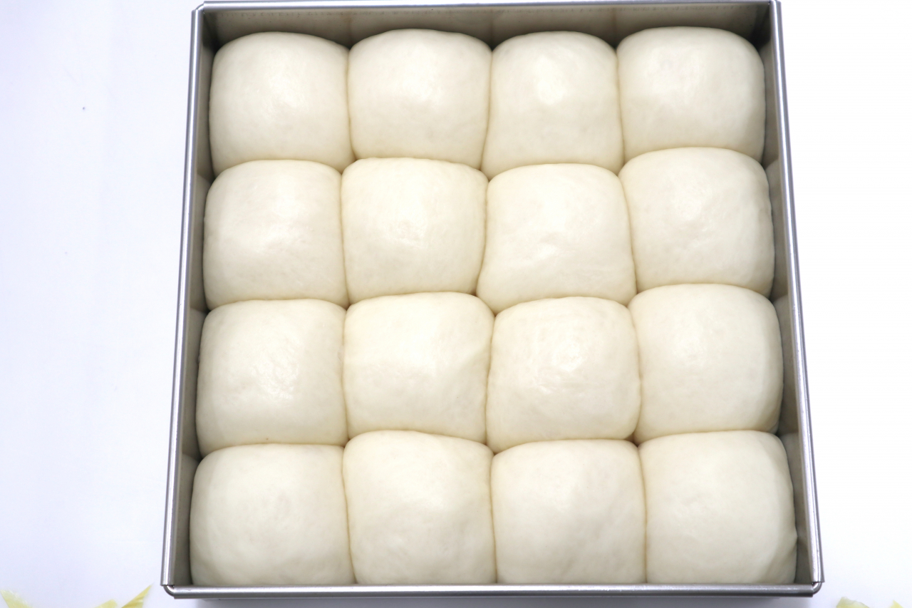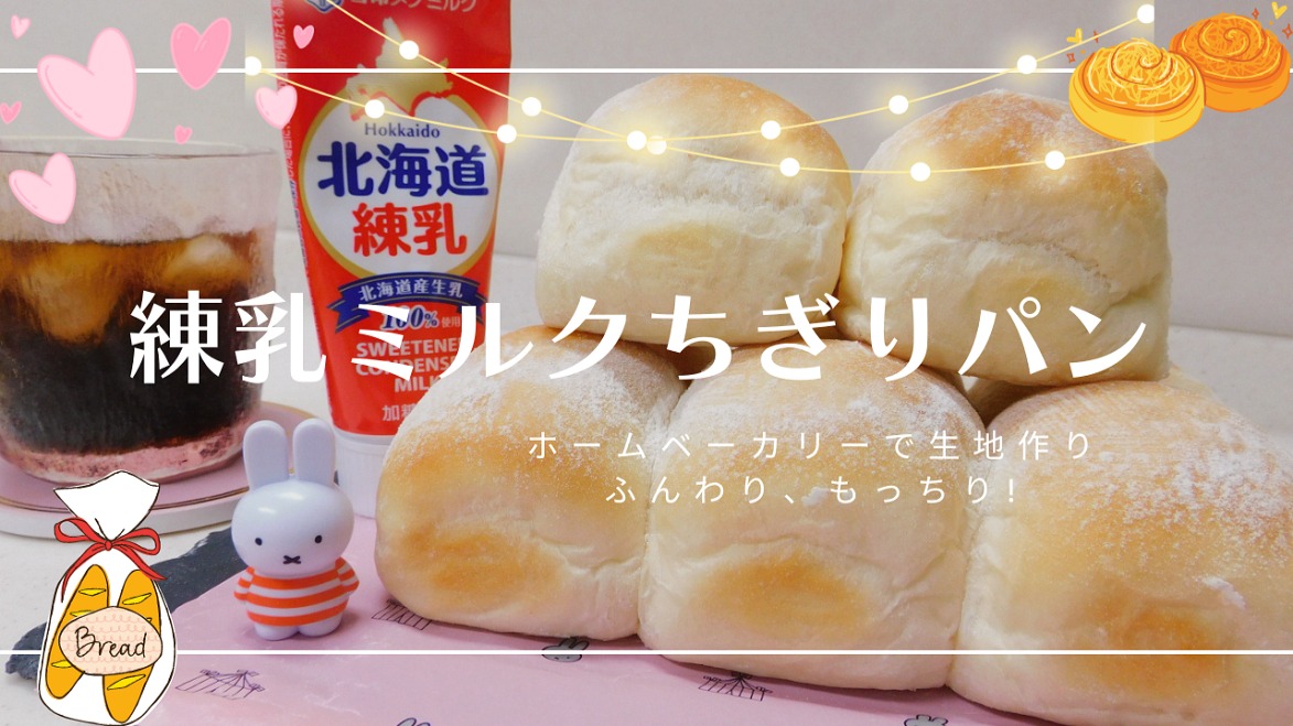 ふわんふわんのちぎりパンを焼きました。, 予想以上に生地がべたついて大変でした😅, 水分量を調節する必要がありますね。,一応分量を記しておきます。, 材料 18㎝スクエア型 , 強力粉200g, 塩3.4g, インスタントドライイースト2.3g, はちみつ 30g, 生クリーム ほいっぷくれーる 75g, 水100g, 作り方, 捏ね~ホームベーカリー, 分割~9分割,。
