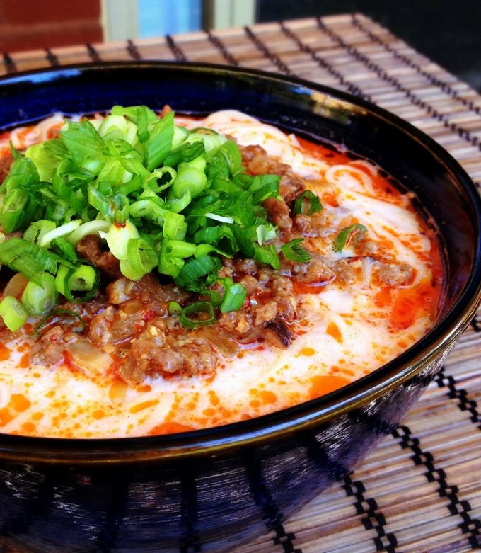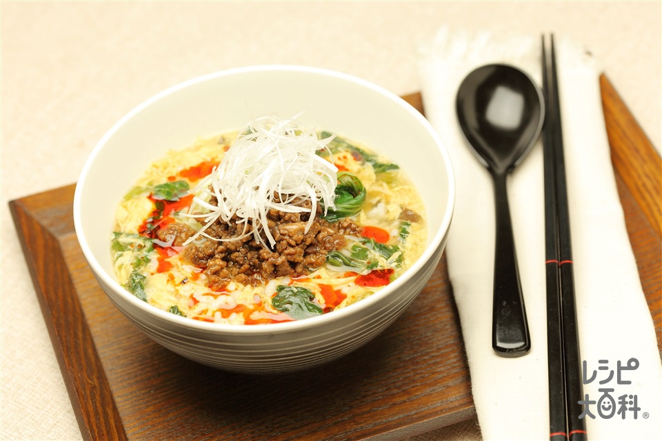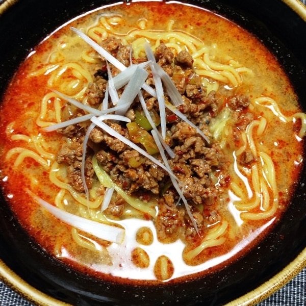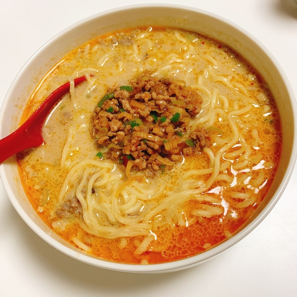 \簡単なのにウマすぎ!担々麺 , 麺は細麺がおすすめで、スープが絡んで美味しい😊, めんつゆは、創味のつゆを使用しました。, ✏︎レシピ⬇︎,〜坦々麺〜,材料 2人分, ・中華麺 細麺2人前, ・豚ひき肉150g, ・青ネギ2本, ・ごま油小さじ2杯,・ラー油小さじ1, ・ラー油 仕上げ用適量, ・白ごま適量, a.豆板醤小さじ1 2,。