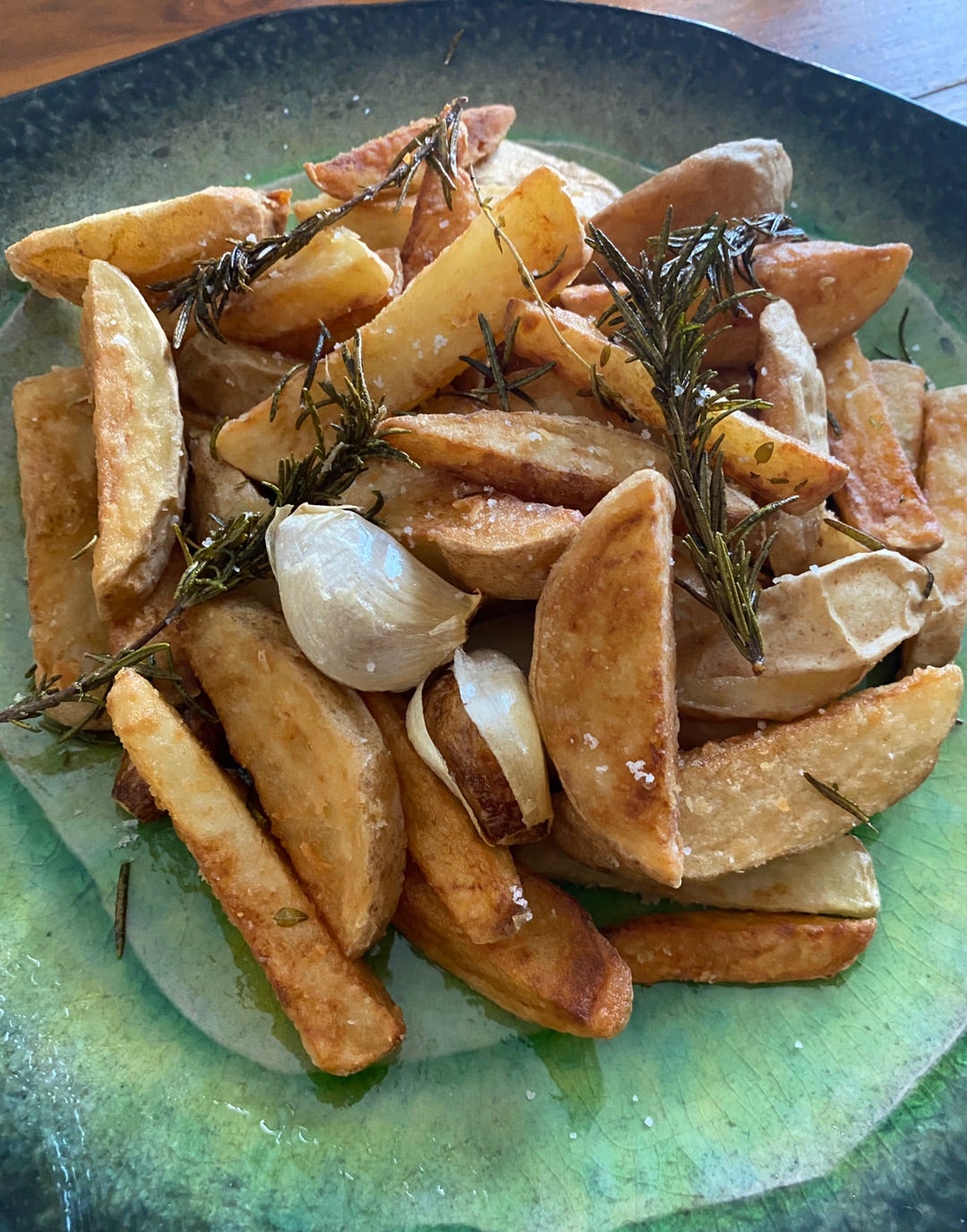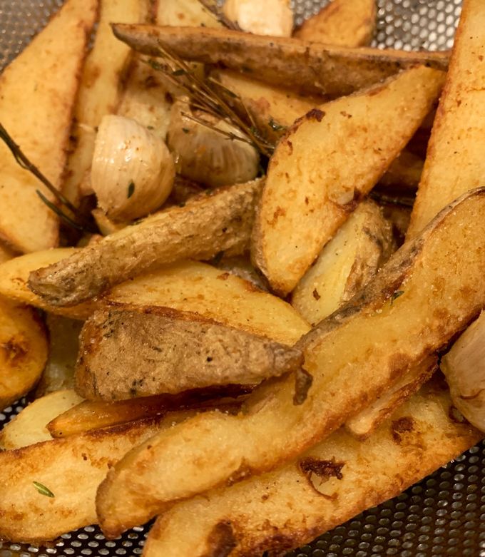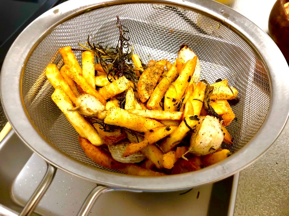 最近の料理です。 「トスカーナ風フライドポテト」 フレンチの名店マルディグラのものを本歌取りさせて頂きました。 正しくはトスカーナ風フライドポテト風 フライドポテトですね。 生のじゃがいもと生ハーブ、ニンニクを低温の油でじっくり火を入れ、最後に高温で仕上げ。
