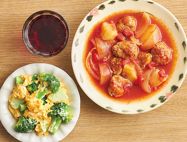 豚こまボールのトマトスープ、ブロッコリーと煎り卵の和えサラダeフレンズ ぱくぱく献立くん。
