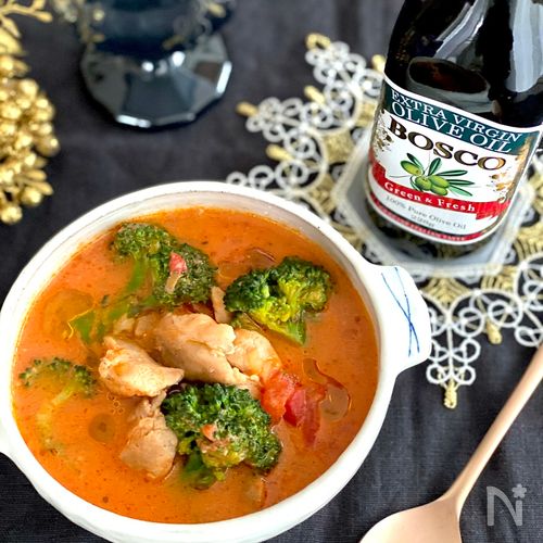 オリーブ香る!鶏肉とブロッコリーの濃厚トマトスープ。