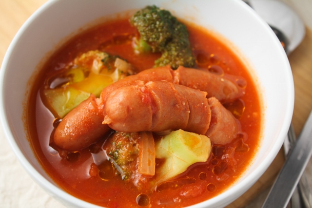 ブロッコリーとソーセージのトマトみそスープOlive Oil Life オリーブオイルライフ。