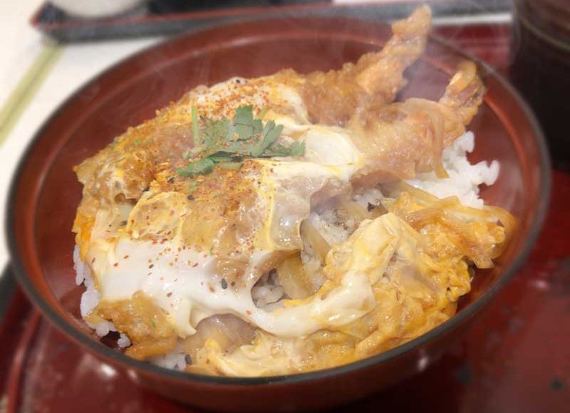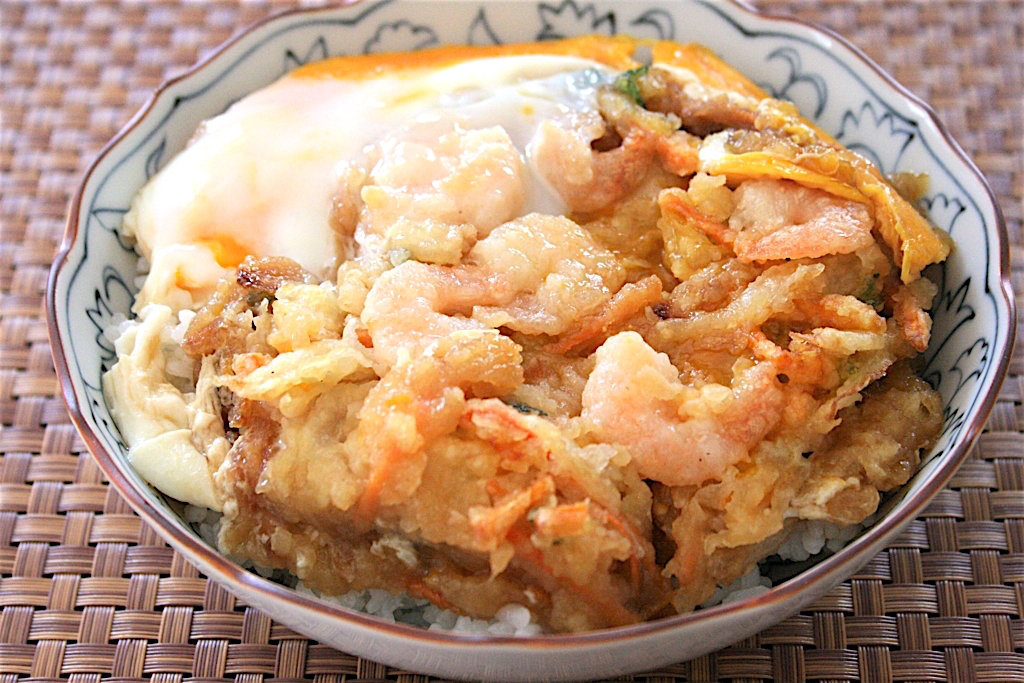 天玉丼・エビと玉ねぎにかき揚げ卵とじ丼 - 男の料理指南。
