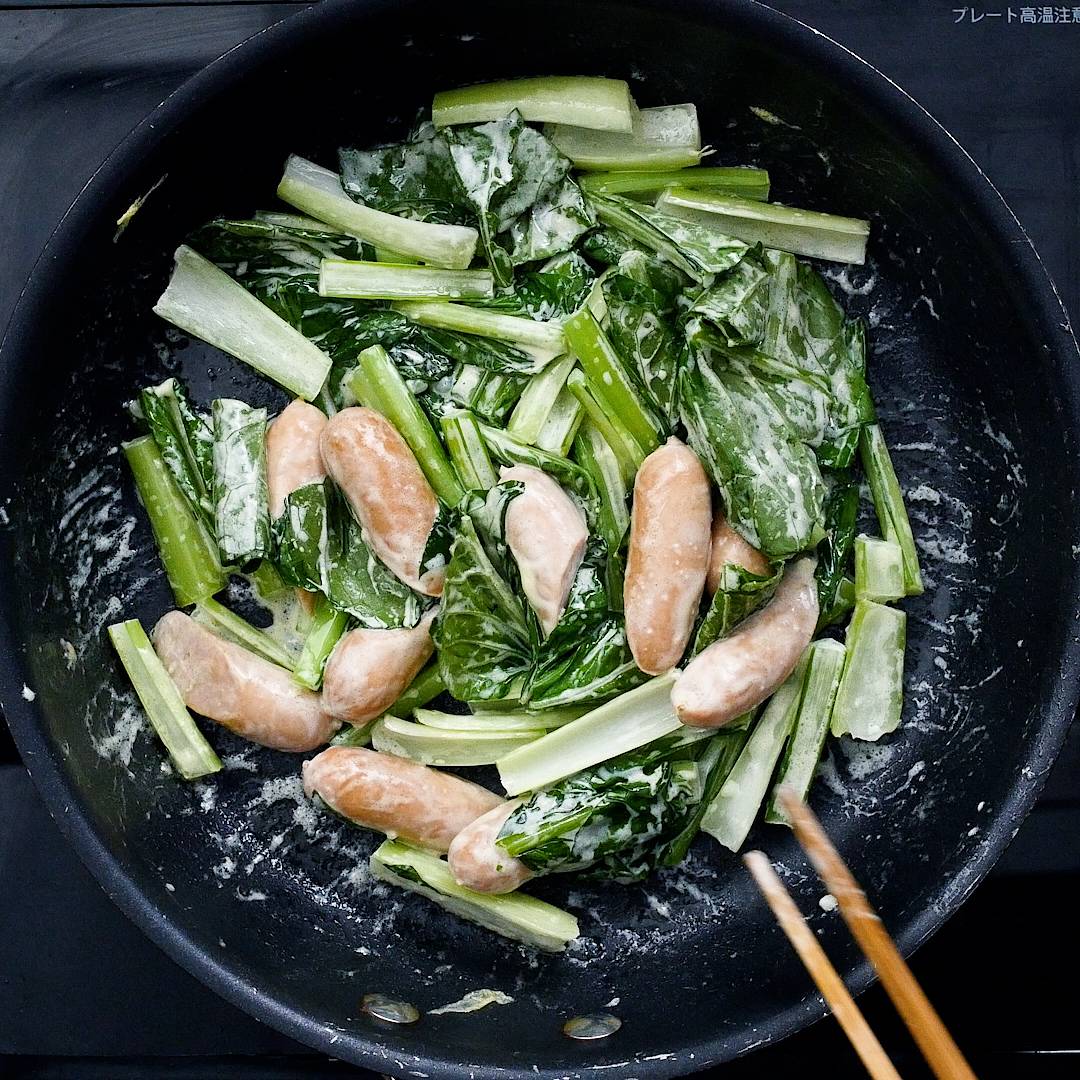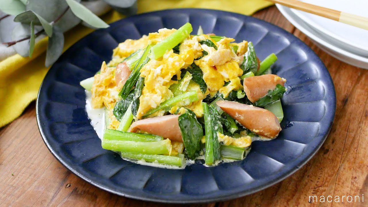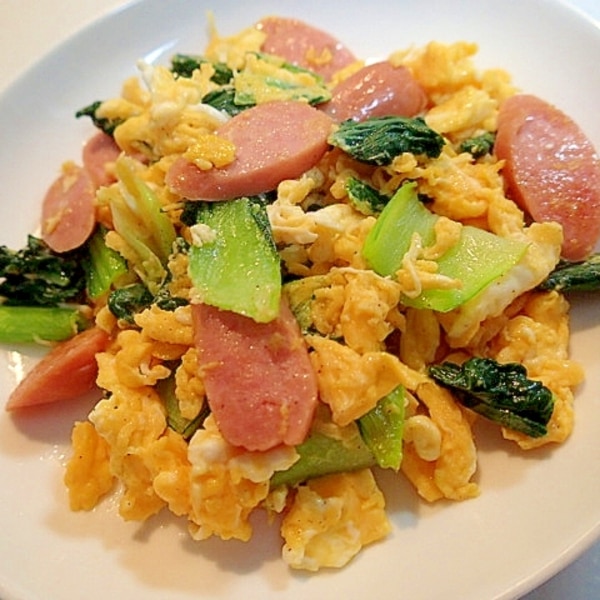 マヨネーズで味付け簡単!コクうま小松菜とウインナーの卵炒め。