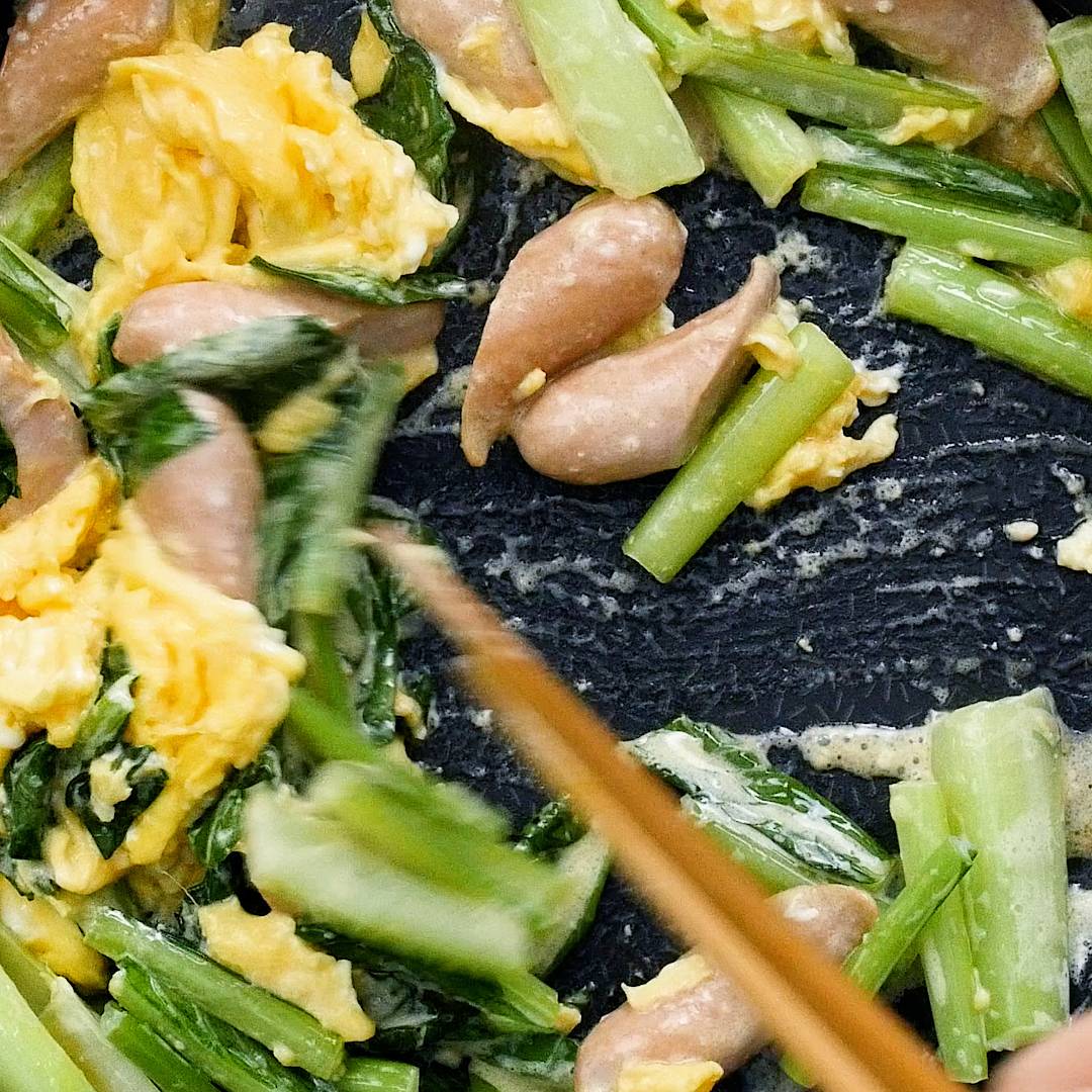 パパッと作れるおかず 卵とウインナーのコンソメ炒め レシピ・作り方Tasty。
