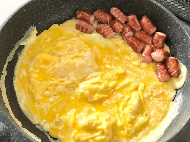 明太子マヨネーズ入りたまごとウインナーの炒めもの。