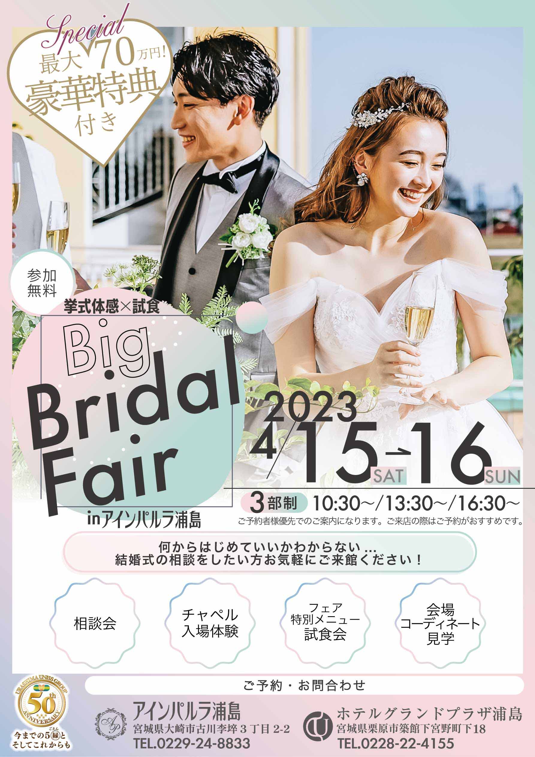 4月BIGブライダルフェア☆ 最大70万円!豪華特典付き- アインパルラ浦島AIN PERLA - 宮城県大崎市古川の結婚式場栗原、登米、石巻からのアクセスも良好。